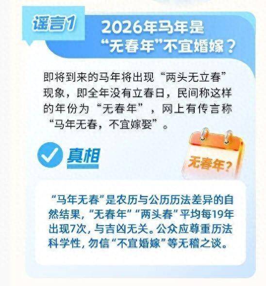 北京网络举报发文辟谣称,事实上,“马年无春”是农历与公历历法差异的自然结果,“无春年”“两头春”平均每19年出现7次,与吉凶无关。