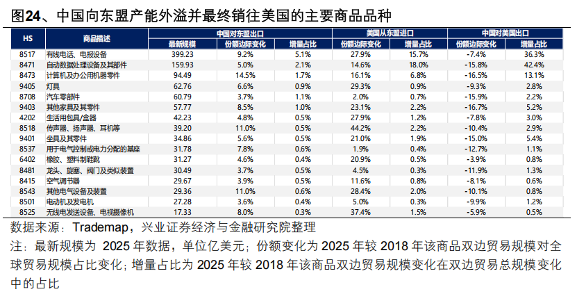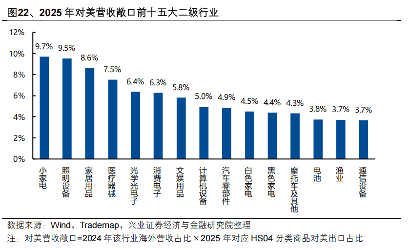 最后,重视关税税率下降后出口链的修复机会。轻工家电、消费电子、电池、汽车零部件以及医疗器械等对美营收敞口大、且在此前对等关税较高的东盟地区有大量产能布局或贸易转口的行业将重点受益于本轮关税下降。
