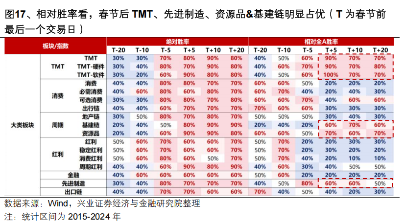 相对胜率看,春节后科技制造、资源品&基建链明显占优。背后,一方面是春节后风险偏好提升驱动TMT、先进制造为代表的成长板块占优;另一方面随着春节后步入“金三银四”春季开工旺季、叠加3月两会后政策集中落地,后续将是涨价线索进一步丰富的关键窗口,对于资源品&基建链形成提振。