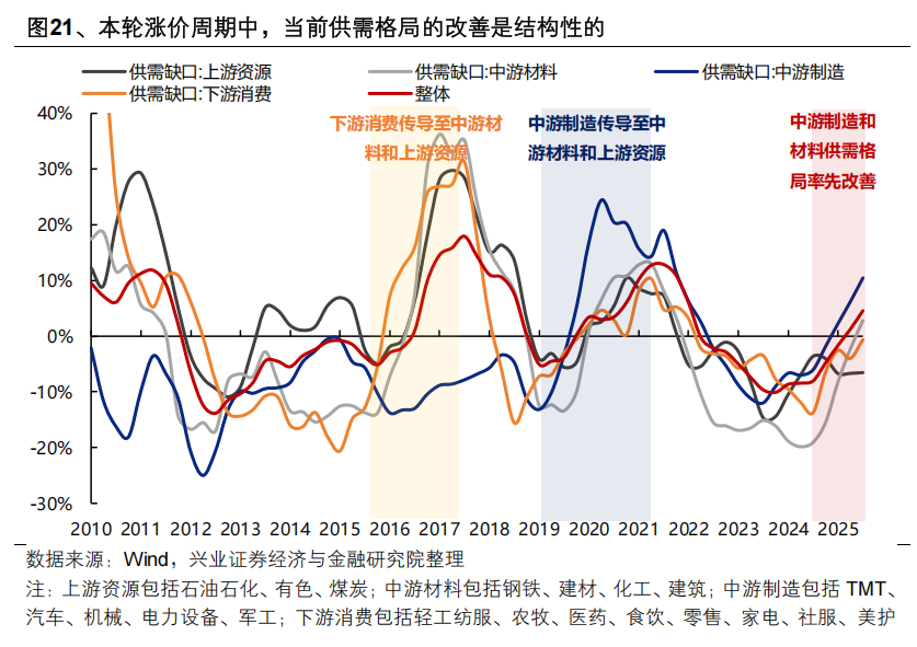 但考虑到本轮供需格局改善带来的涨价更多是结构性的,当前涨价更可持续的领域或将仍以中游材料和制造为主。供需缺口是涨价最本质的逻辑,当前已具备供需缺口的领域涨价将更具备持续性。分产业链来看,本轮涨价周期中,供需缺口率先发生在新兴产业趋势和“反内卷”受益的中游材料(化工、钢铁、建材等)和中游制造(TMT、高端制造)领域,内需相关的下游消费制造业基本维持均衡,而地产链相关的上游资源仍然存在一定供给过剩。因此,当前涨价更可持续的领域或将仍以中游材料和制造为主,对于与内需和地产链相关性较强的上游资源和下游消费的涨价机会,仍需观察后续供需改善的传导是否顺畅。