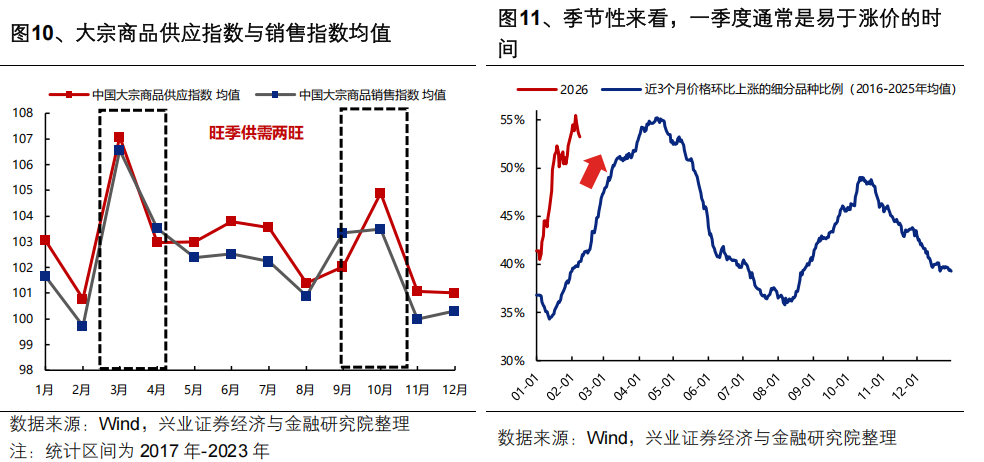 另一方面,每年的3-4月份,通常是市场对宏观体感最好、对顺周期板块乐观预期最易于发酵的时间,为涨价交易提供有利的时间窗口。每年3-4月份,中国高频经济活动指数和花旗中国经济超预期指数均会迎来季节性上行,一方面是两会政策定调后,各类宏观政策加速落地,容易引发市场对未来经济的乐观预期;另一方面是随着春季开工旺季到来,乐观预期也易于找到高频数据的积极验证。因此,3-4月份本身也是市场对宏观体感最好、对顺周期板块乐观预期最易于发酵的时间,为涨价交易提供有利的时间窗口。