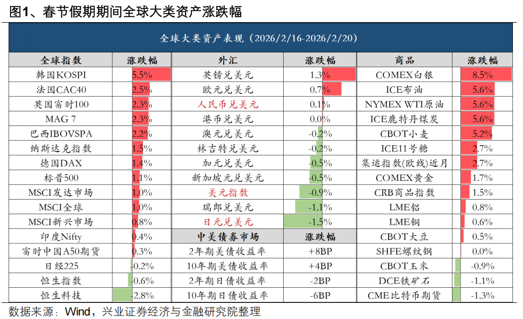 春节假期期间,在全球流动性预期纠偏、地缘局势与关税风波的共振影响下,主要资产迎来上涨。一方面,全球资产价格仍在对此前沃什带来的过度悲观的流动性预期进行纠偏,叠加哈塞特等官员释放鸽派信号,驱动全球主要股指和贵金属价格继续修复;另一方面,伊朗地缘局势再度紧张推动石油价格大涨。假期尾声的关税风波为全球资产价格再添新逻辑,美国最高法院裁定IEEPA关税违法后,全球资产价格率先反映有效关税降低和特朗普行政权收缩带来的积极影响,权益资产、贵金属等“弱美元资产”走强。
