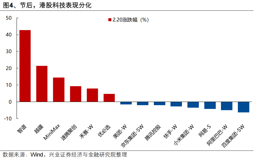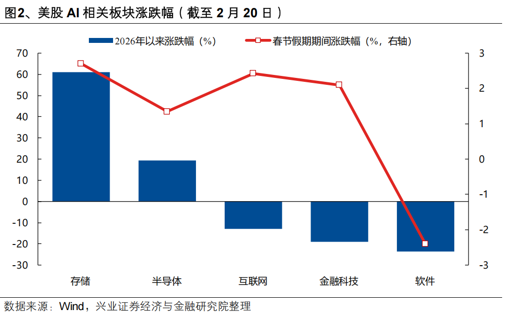 AI方面交易的更多是分化,背后是科技巨头大幅加码资本开支、大模型能力快速进步后,投资者从前期狂热的“无差别拔估值”开始转向对应用商业化落地、传统商业模式可持续性的理性思考。一方面,近期国内外一系列大模型能力的快速进步,正在印证AI对于世界的颠覆性变革,并正在引发投资者对于传统商业模式可持续性的担忧。反映到资本市场上,全球软件和金融科技板块显著承压,节后港股互联网的调整也在一定程度上反映了AI替代传统互联网商业模式的担忧;另一方面,市场对于AI相关公司的定价也更加看重产品力与商业化变现能力,也导致美股谷歌与微软、港股两家大模型新贵&人形机器人企业与传统互联网企业股价表现的分化。