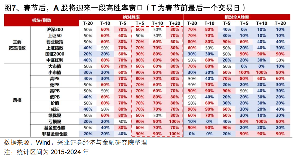 首先,节后A股将迎来一段高胜率窗口。春节后,随着风险偏好提升、增量资金释放,叠加对两会政策的期待下,主要指数胜率迎来明显提升,A股本身就将迎来全年胜率较高的一段窗口。