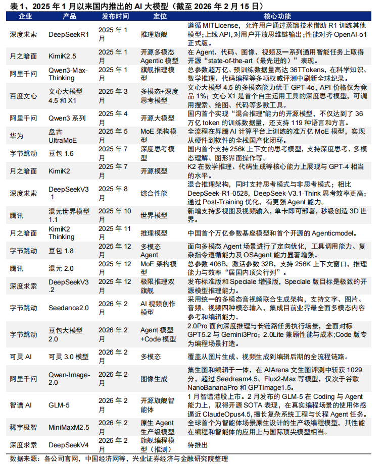 AI方面,机器人和大模型在春晚舞台的“出圈”,标志着AI从“概念”走向“落地”的关键转折,极大地提振了国内今年AI商业化落地的信心。今年春晚多款国产人形机器人惊艳亮相,其行云流水的动作表现与丰富的场景应用,充分印证国内人形机器人已具备优异的运动控制能力与真实落地场景,也有助于加快全社会对人形机器人产品的认知与接受度。随着核心技术的持续突破与场景落地的加速推进,今年有望是国内外人形机器人共振量产和商业化落地的元年。近期发布的字节Seedance2.0大模型也以春晚为首个公开应用场景完成首秀,参与了《贺花神》、《驭风歌》、《快乐小马》等节目的视觉定制,完成规模化应用的首次实战检验,展现了国产大模型的多模态能力的跨越式提升。今年,国内AI应用有望完成从模型落地到场景变现、从概念叙事到业绩兑现的转化,模型迭代与场景渗透有望实现共振。
