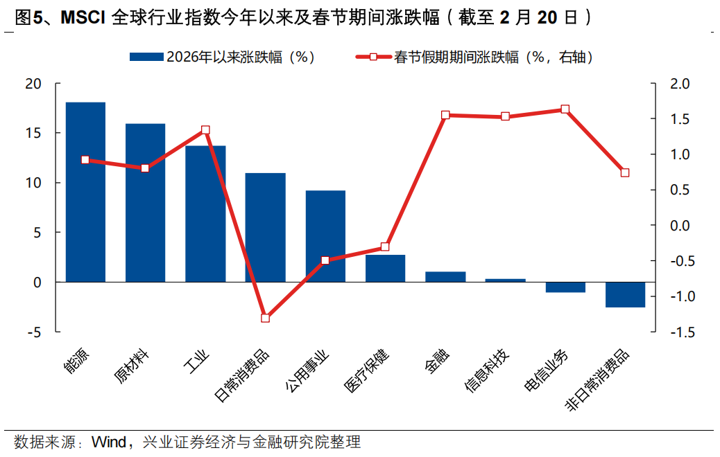 兴业证券认为,AI和资源品依然是全球市场关注的两大焦点。AI方面,机器人和大模型在春晚舞台的“出圈”,标志着AI从“概念”走向“落地”的关键转折,极大地提振了国内今年AI商业化落地的信心。资源品方面,除了全球宏观叙事继续提升资源品战略性配置价值之外,国内新一轮价格周期的上行也在进一步丰富涨价线索。往后看,3-4月作为国内验证涨价、交易涨价的重要窗口,随着国内涨价线索的进一步丰富,涨价作为当前企业盈利回升和市场风格扩散的重要逻辑,可能会被当成一个核心线索去交易。